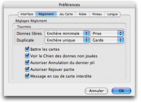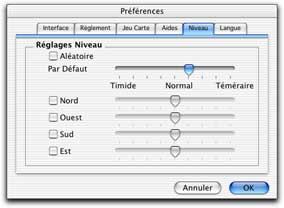 Cette option permet de choisir le caractère de l'ordinateur: entre Timide et Téméraire. Ce réglage influence surtout les enchères mais aussi certains choix à l'écart et le jeu de la carte.