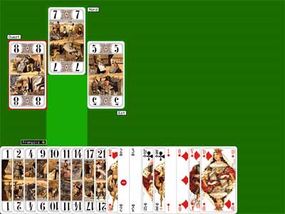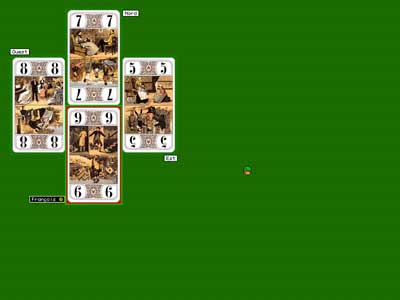 La partie supérieure de lécran est utilisée pour laffichage des cartes jouées par les 4 joueurs au cours dun pli. Les cartes sont disposées suivant les 4 points cardinaux. Lemplacement du Preneur est indiqué par une couleur de fond plus claire que les 3 autres et le maître du pli voit sa carte entourée de rouge.