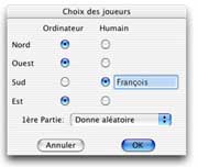 Un dialogue permet alors de choisir pour chacun des 4 joueurs, qui de lordinateur ou de lutilisateur le contrôlera. Les joueurs humains ont de plus la possibilité de saisir leur nom.