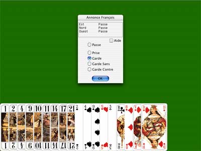 Il est à remarquer que cest lordinateur qui choisira les atouts de la poignée (si le choix est possible). Mais ce choix est parfaitement effectué: les atouts qui étaient dans le Chien sont montrés et les Bouts sont, si possible, cachés avec priorité au Petit.