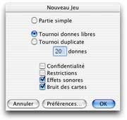 Pour lancer une partie, sélectionner dans le menu FICHIER loption NOUVEAU. Un dialogue vous permet alors de choisir quel type de parties vous désirez jouer: partie simple, tournoi donnes libres, tournoi duplicate.