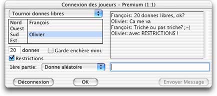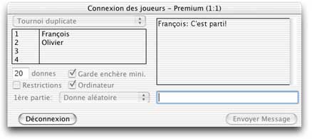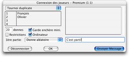 Dans ce dialogue, la liste des joueurs participants au tournoi est affiché et les différentes options de jeu sont modifiables: type de tournoi (ci-dessus donnes libres, ci-dessous duplicate), nombre de donnes, Garde enchère minimale, restrictions, participation ou non de lordinateur au tournoi duplicate, première partie aléatoire ou autre.